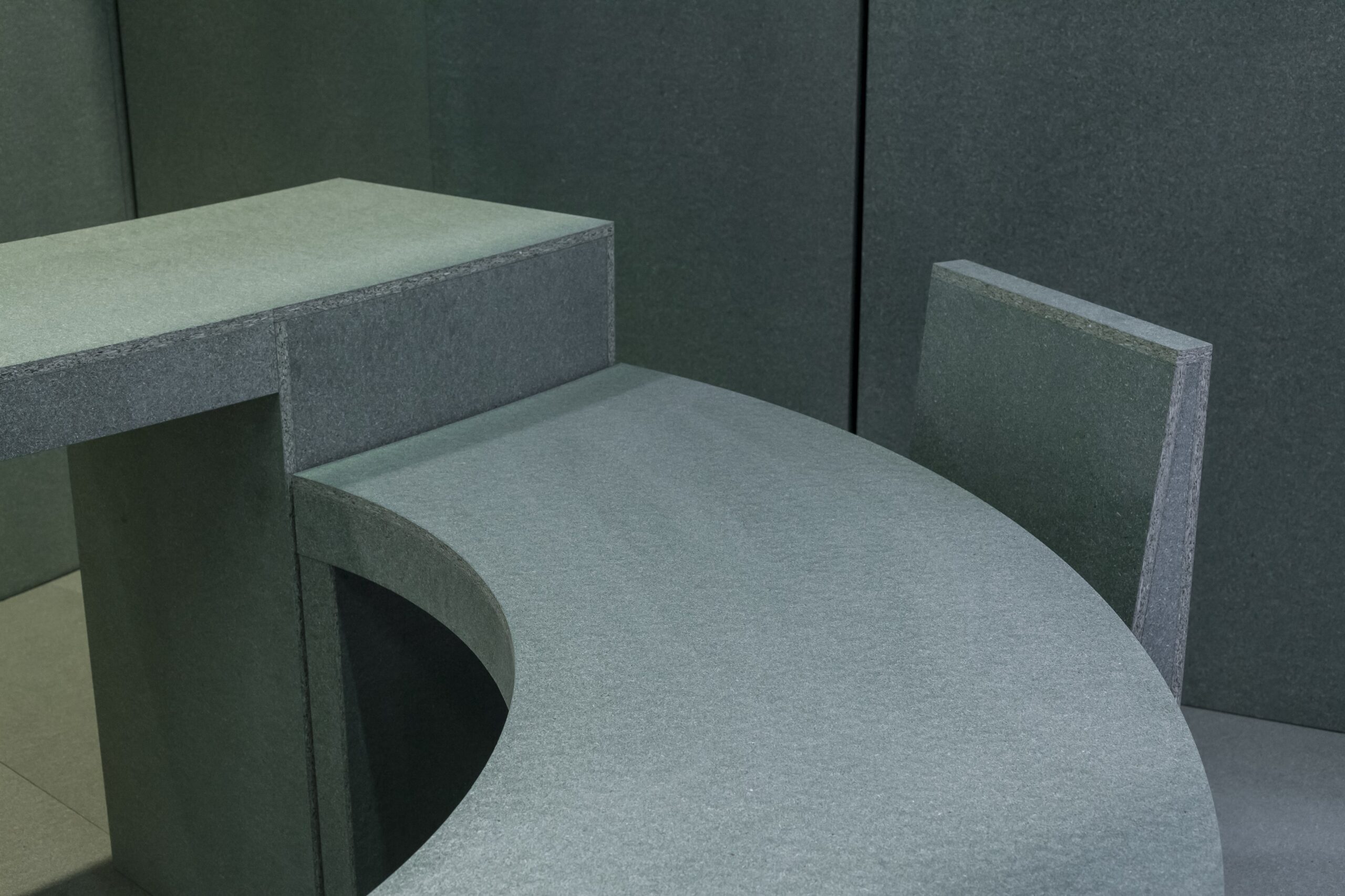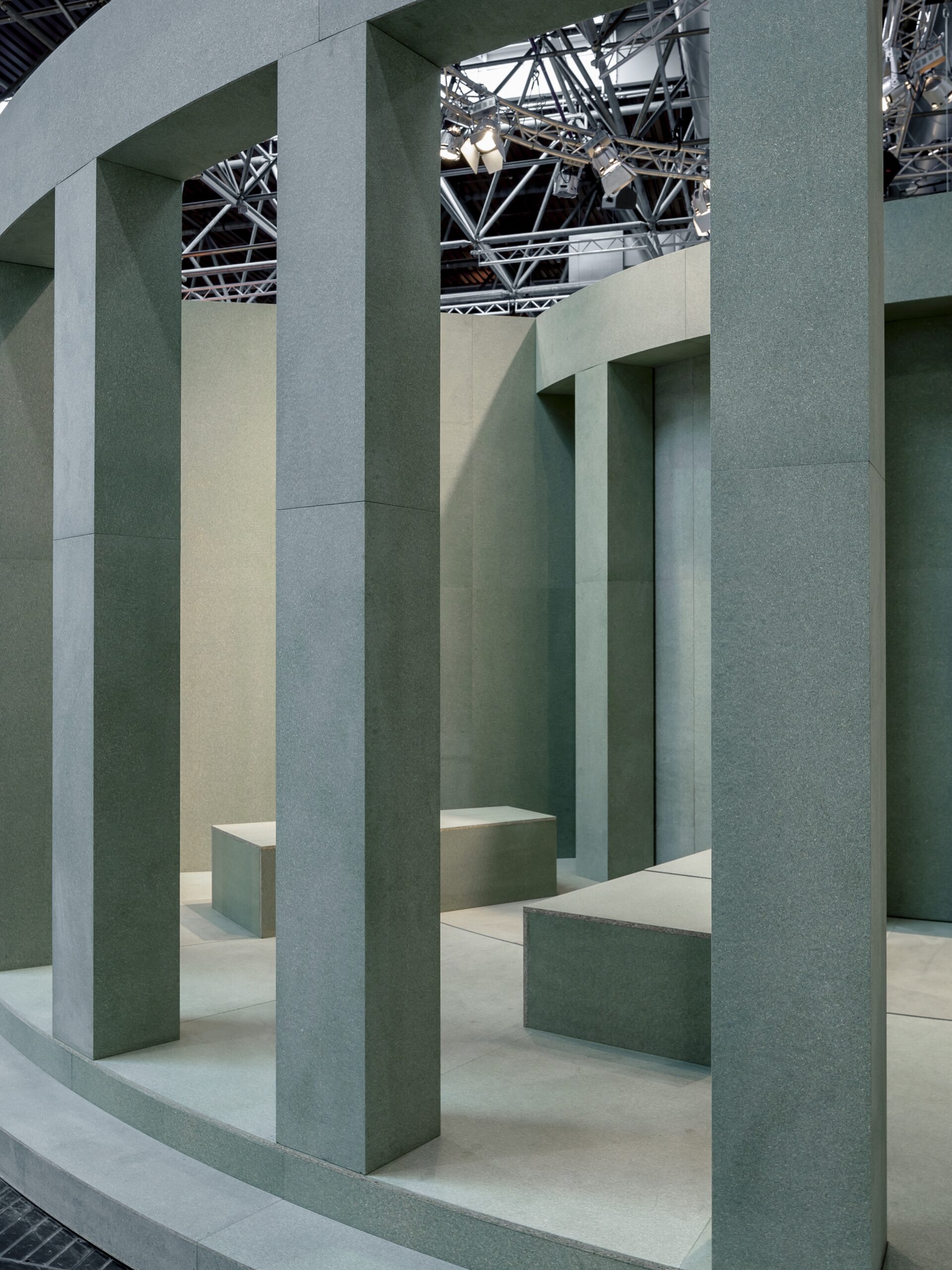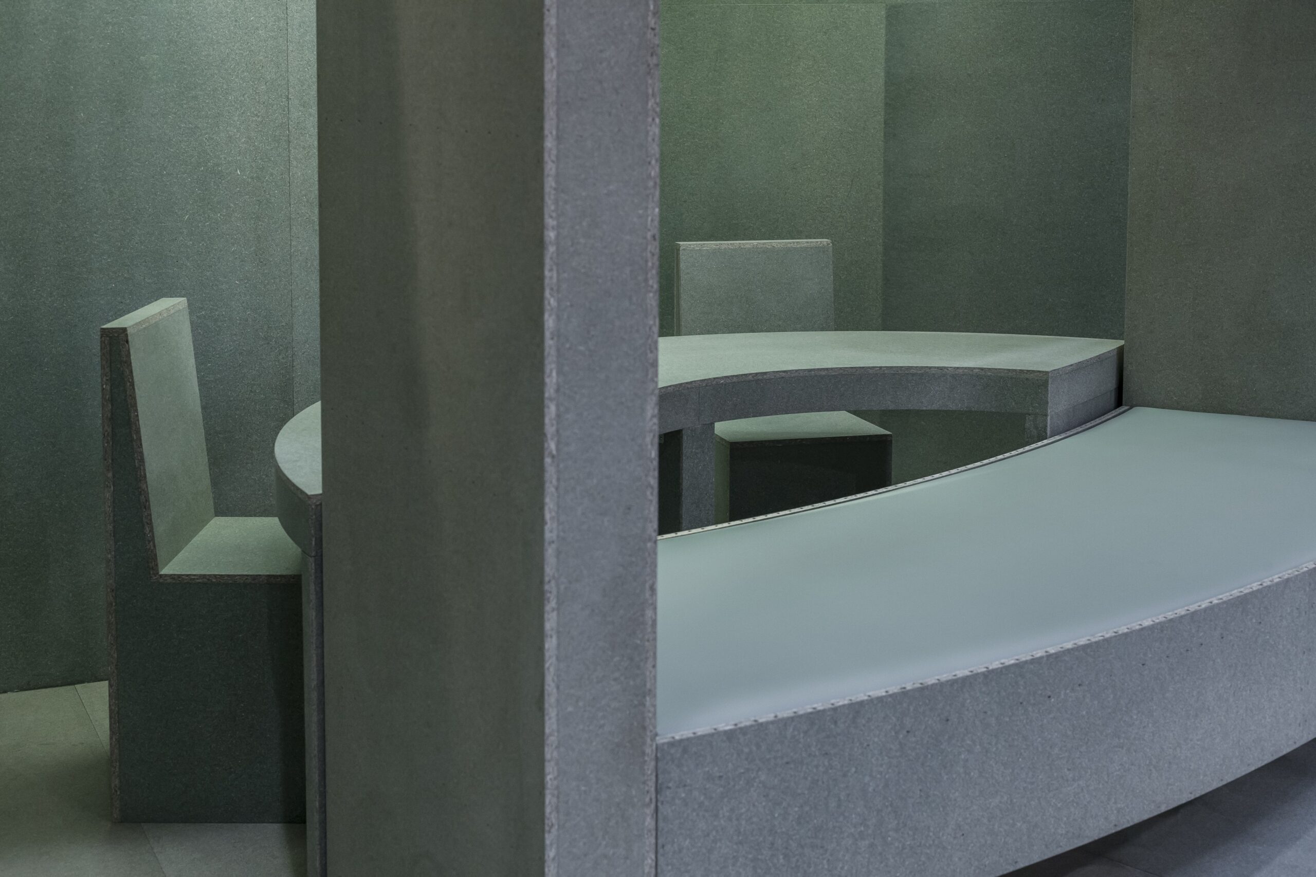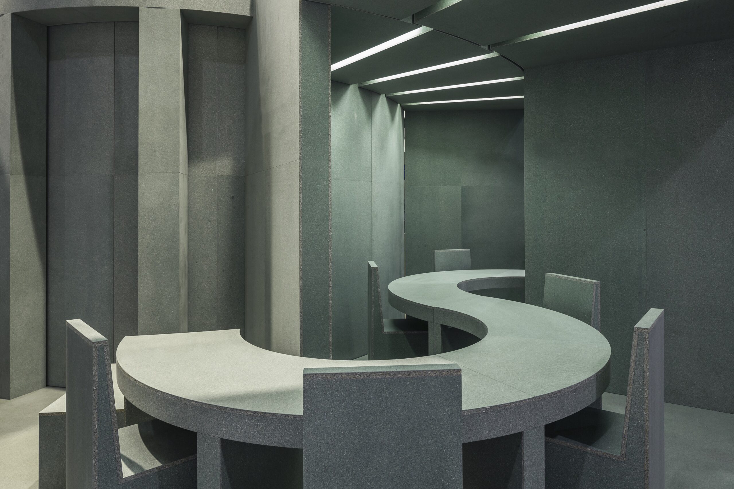The design offers a contemporary take on the traditional exhibition: a more autonomous and laid back approach to stand out from the crowd. It provides visitors and exhibitors a more casual way of interacting. This approach also echoes in the low-key use of material; waterproof particle board only. During the Euroshop Retail Trade Fair that took place in March 2017 in Düsseldorf, the exhibition pavilion of German spatial design agency Designplus was open to the public for five days.