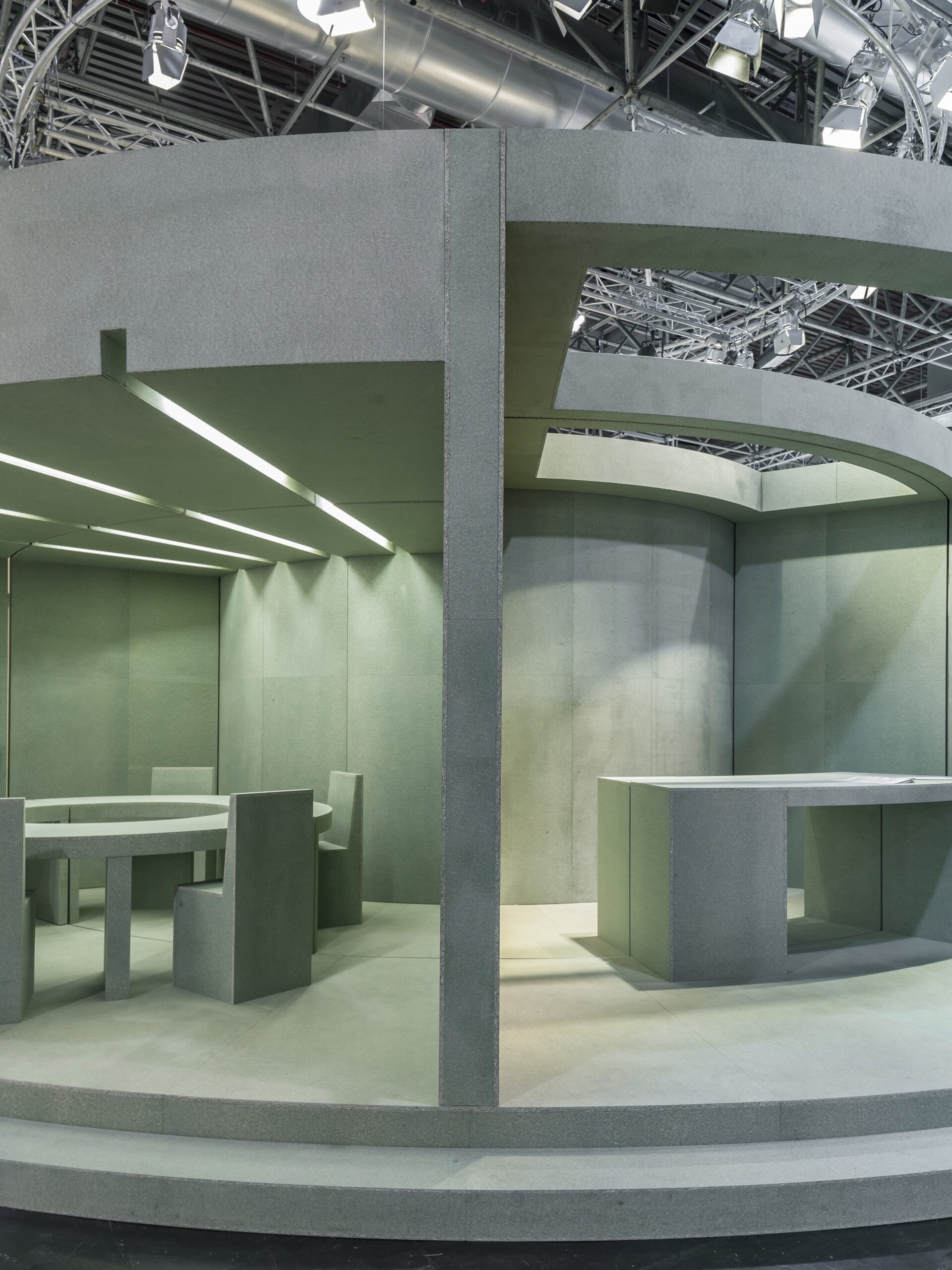 The exhibition consists of six archetypical rooms mounted on two circular platforms with a twist: every twenty minutes the centre ring rotates 60 degrees. This creates six surprising new scenarios, hence the nickname ‘Crocopotamus’ after the children’s book by Mary Murphy. Including the bar in the centre there’s a total of 37 different room combinations possible.